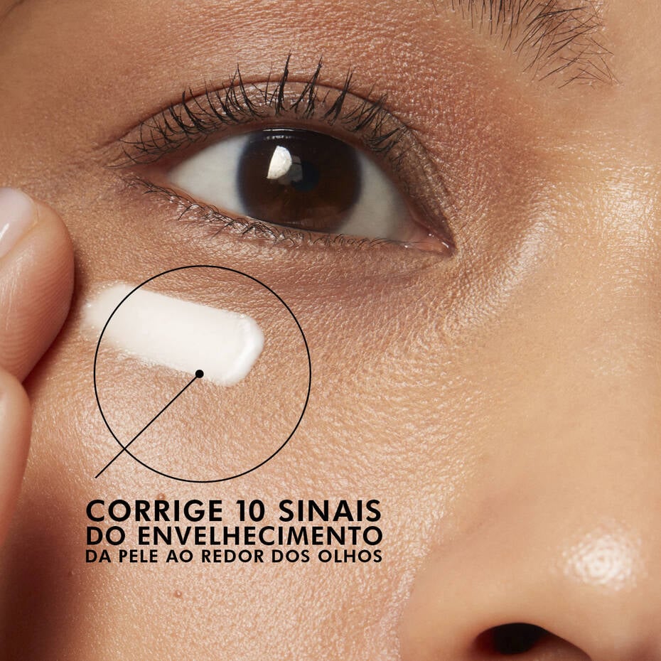 Tratamento antirrugas para o contorno dos olhos que corrige os 10 sinais visíveis do envelhecimento da pele ao redor dos olhos: rugas abaixo dos olhos, pés de galinha, inchaço, olheiras, flacidez, textura irregular, ausência de elasticidade, hiperpigmentação, ressecamento e perda de luminosidade.