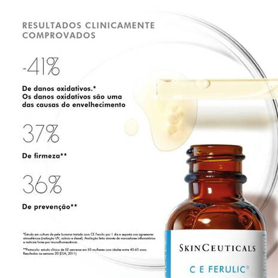 C E Ferulic é um Sérum Antioxidante com Vitamina C Pura de uso diurno com fórmula patenteada. possui uma combinação sinérgica de antioxidantes, incluindo 15% de vitamina C pura (ácido L-ascórbico), 1% de vitamina E (alfa-tocoferol) e 0,5% de ácido ferúlico.